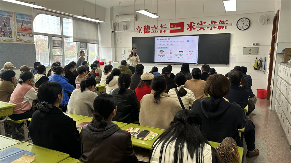 数学备课组长张雷雷带来《“数”启智慧 “学”育未来》的主题分享。他结合一年级数学教材特点,介绍了数感培养、运算基础、逻辑思维启蒙等学习内容,提出“在生活中学数学、在实践中用数学”的理念,指导家长通过趣味游戏、日常观察等方式激发孩子的数学兴趣,培养认真审题、规范书写的良好习惯,为数学学习筑牢根基。