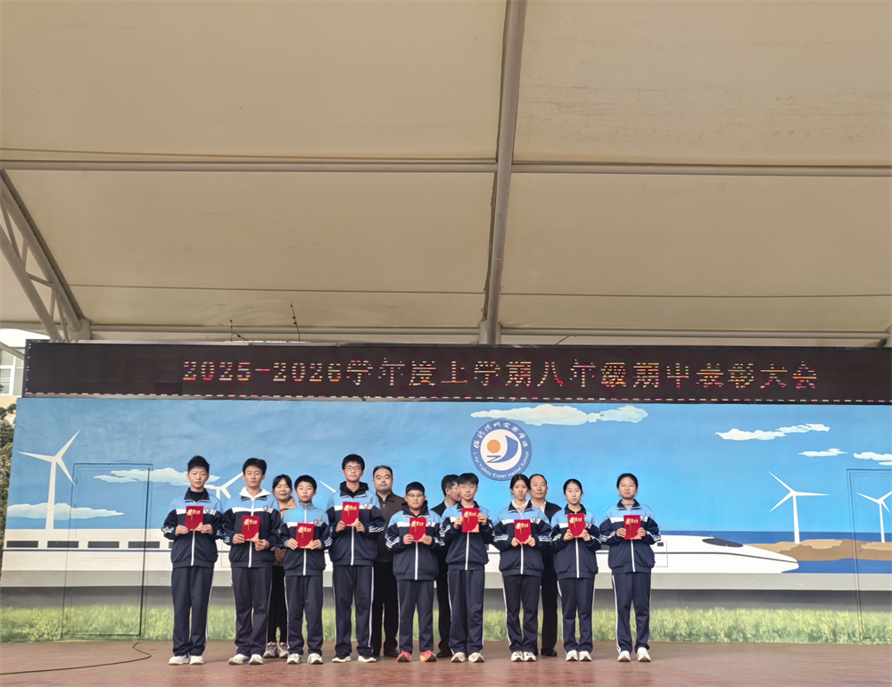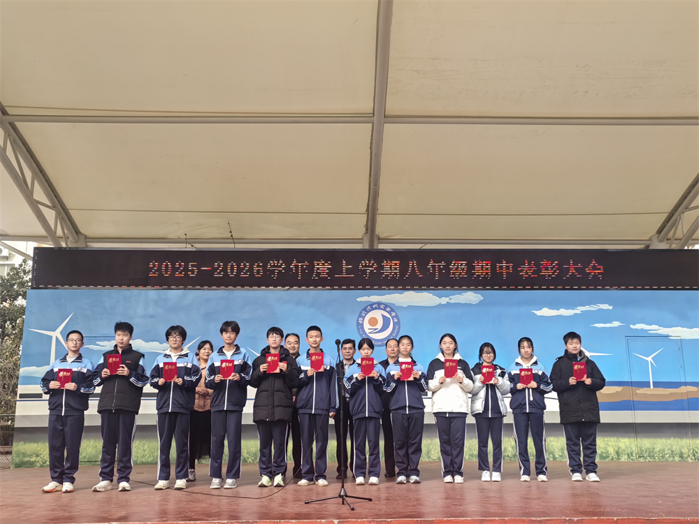 颁奖环节将大会推向高潮。激昂旋律中,获奖学生身着整齐校服按班级登台,校领导为其颁发荣誉证书并合影。台上学子自信昂扬,尽显少年朝气,这份荣誉是过往汗水的结晶,更是未来前行的动力。