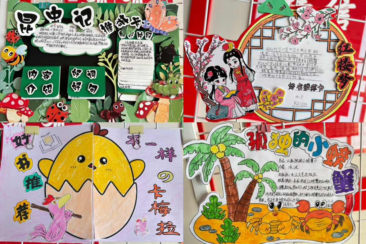 活动中,同学们热情投入,利用课余时间精心挑选自己最喜爱、最受启发的书籍,认真撰写推荐理由、摘录精彩段落、描绘心中的人物形象,并分享自己的阅读感悟。普通的卡纸,在同学们的巧手与创意下,变成了一张张图文并茂、独具特色的“阅读名片”。有的作品色彩明快、布局巧妙;有的文字真挚动人、感悟深刻;更有形式新颖、充满想象力的设计,展现了孩子们对阅读的热爱与理解。