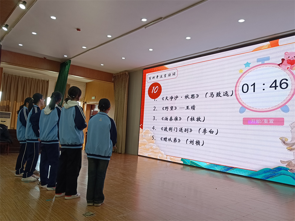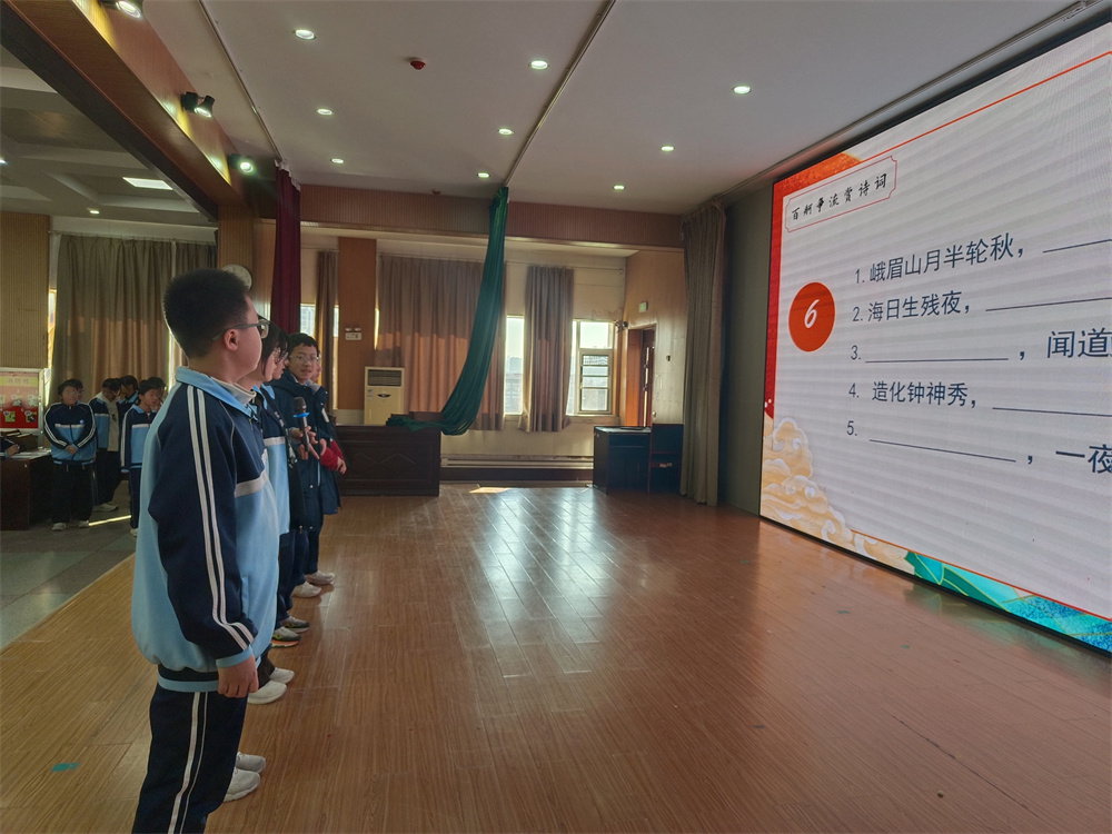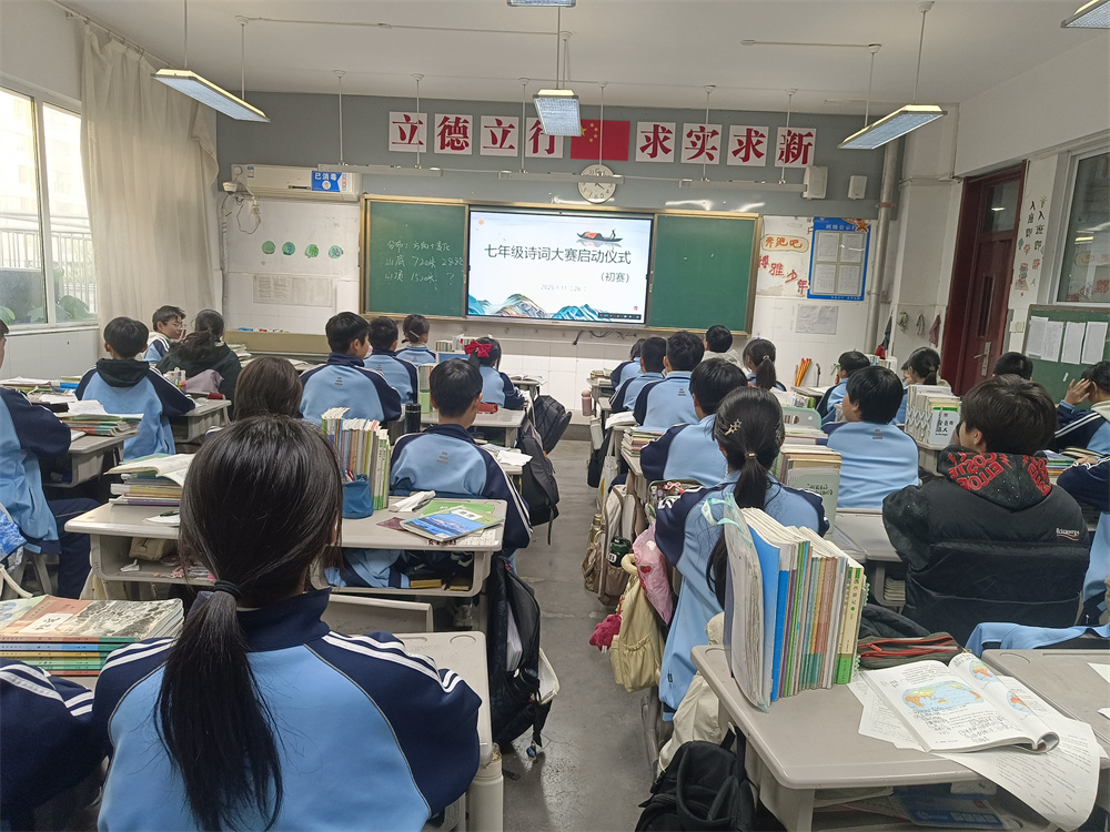 12月上旬,七年级以班级为单位开展了诗词背诵初赛。各班学生积极参与,在诵读中体会诗词韵律,在积累中提升语文素养。经过班级内部选拔,每班评选出5名优秀选手,组成代表队晋级年级决赛。