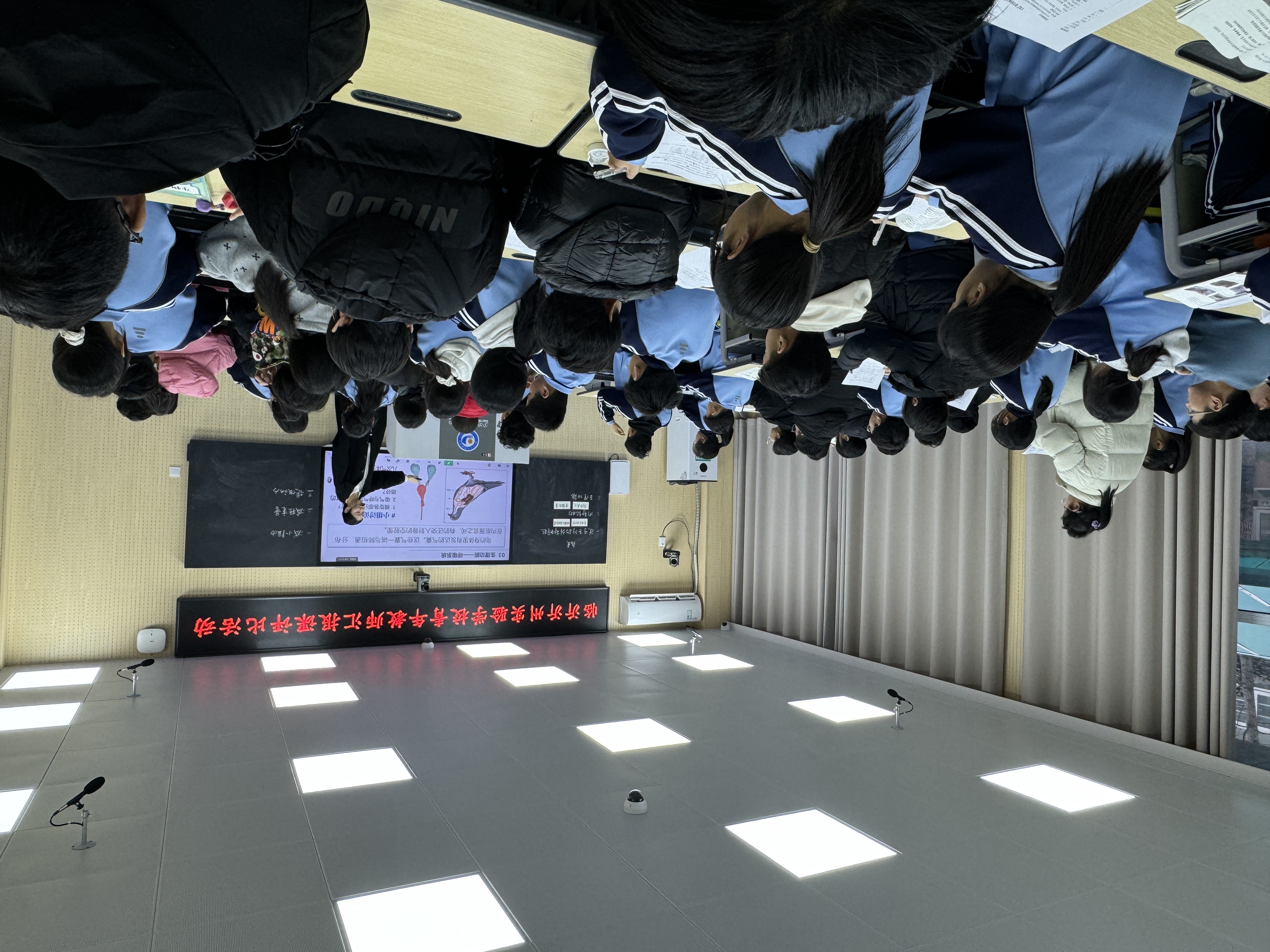 张雨老师的语文课《小圣施威降大圣》以任务驱动引导学生梳理孙悟空与二郎神的斗法情节,通过创意续演和细节品读,让经典形象鲜活起来,激发学生对名著的热爱与想象;栾梦雪老师的生物课《鸟》围绕飞行奥秘展开,借助生活化实验模拟鸟类“双重呼吸”,将抽象知识直观化,并融入候鸟迁徙纪录片,唤起学生对自然规律的敬畏;徐琳轩老师的音乐课《红旗颂》采取分层教学,引导学生感知旋律情感,并通过指挥实践、打击乐创编等互动,让学生在参与中理解作品精神,实现美育与德育的有机融合。